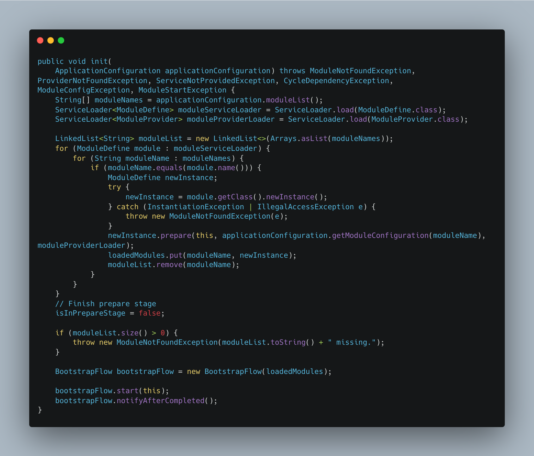 - 创建BootstrapFlow对象,启动ModuleManager对象,完成后调用notifyAfterCompleted()方法通知所有的ModuleProvider实例,表示可以对外提供服务了