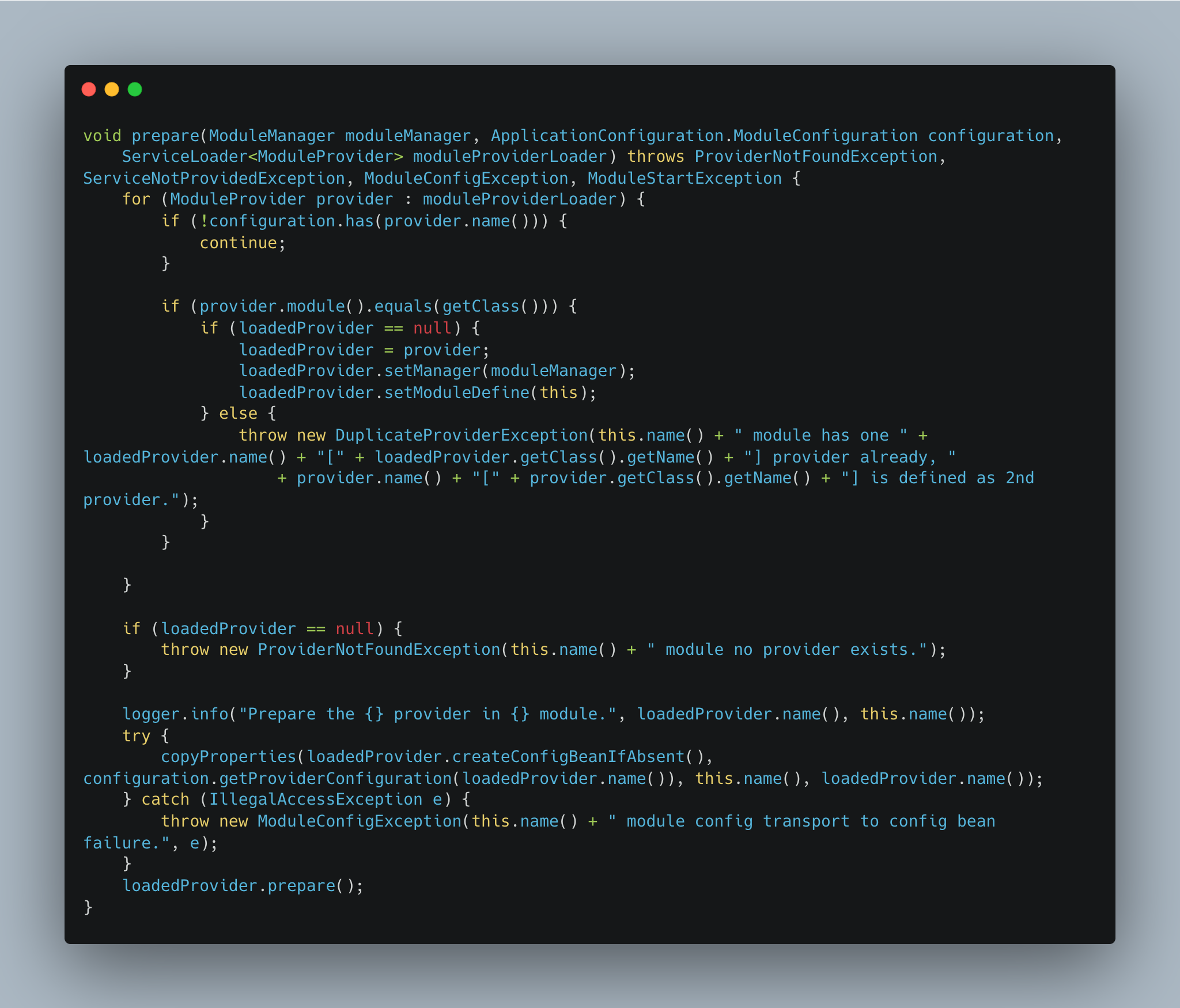 - 调用ModuleProvider的prepare()方法让提供者也进入准备状态,prepare()方法是ModuleProvider的抽象方法,具体方法由它的子类来实现,每个模块的prepare()方法也不同,每个模块仅对应一个ModuleProvider