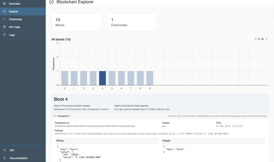 登录 SAP 云平台超级账本控制台,能看到之前通过 post 写入的数据已经加入到区块链尾部的区块了。点击区块可以查看数据明细: