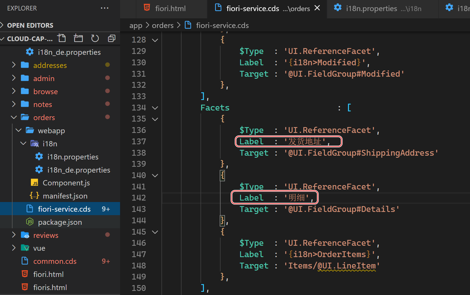 给对应的 Fiori Elements 字段(forms 中的)添加 Label,以及 table column 字段添加 header: