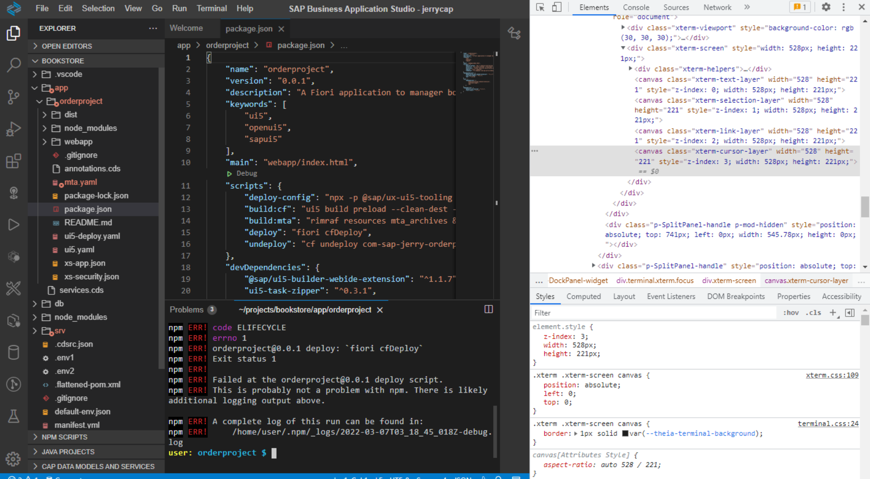 我们使用 Chrome 开发者工具打开 Business Application Studio,发现 terminal 面板通过一个 canvas 标签页实现。
