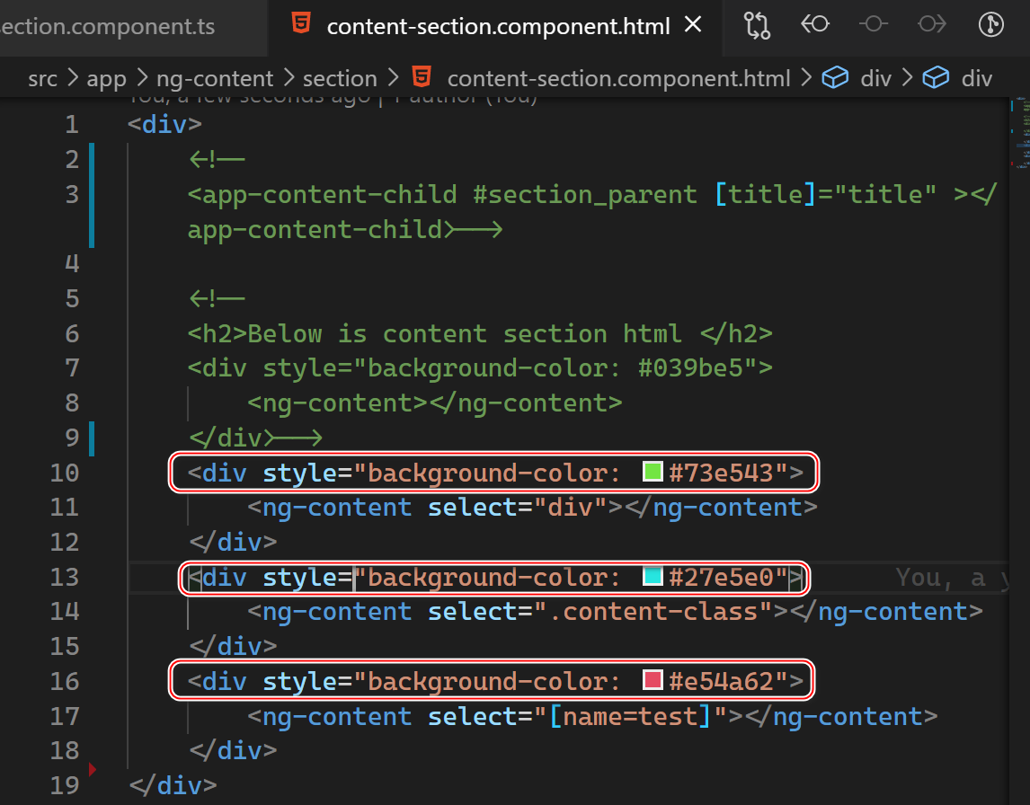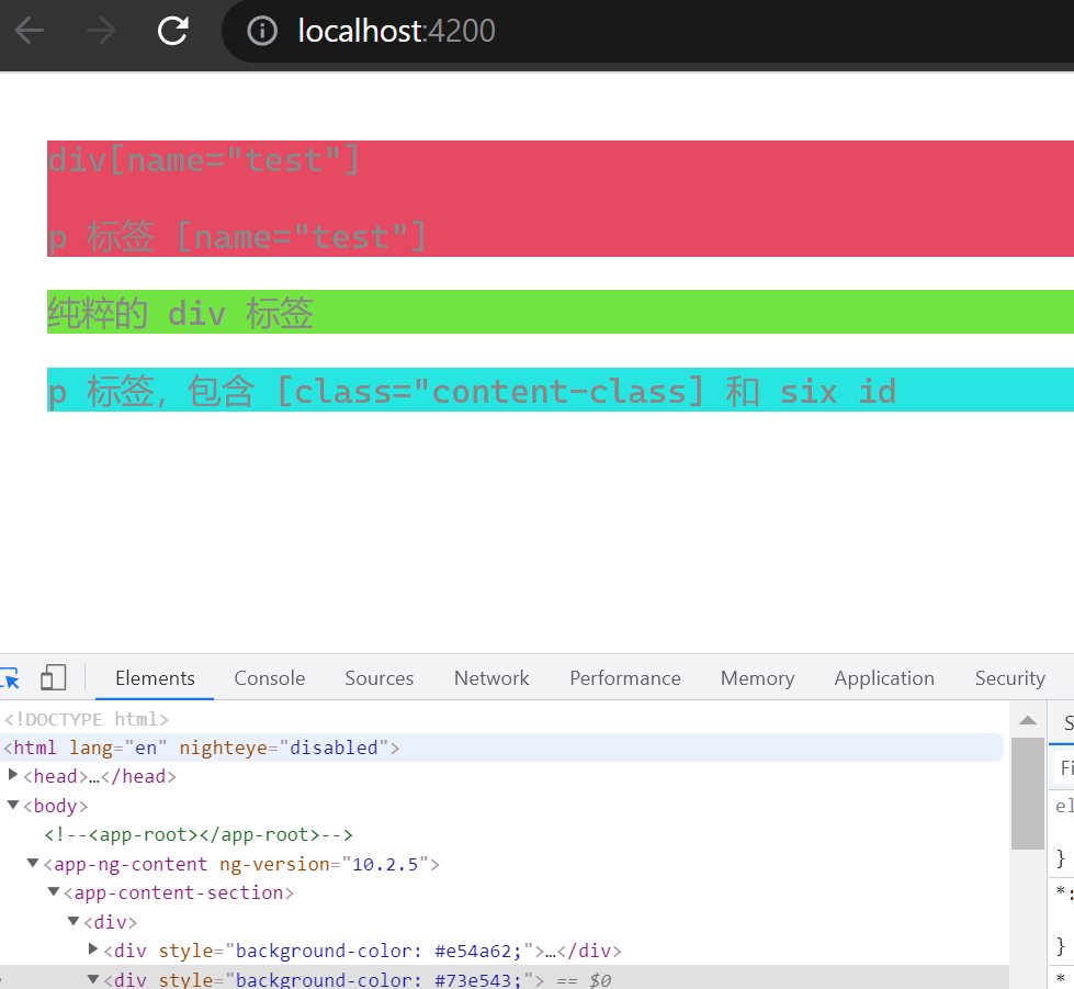 app-content-section中包含两个 div 元素,故最后的绿色区域里,包含了两个 div 值: