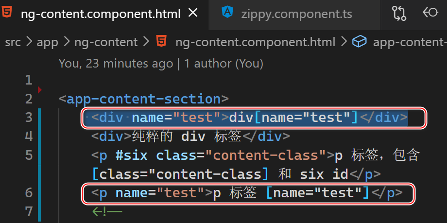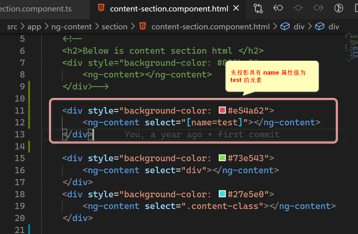 接下来的问题是,消费者传入的元素里,第一个 div 元素和最后一个 p 元素的 name 属性值都为 test,为什么只有最后一个 p 标签,被投影到 app-content-section 里呢?