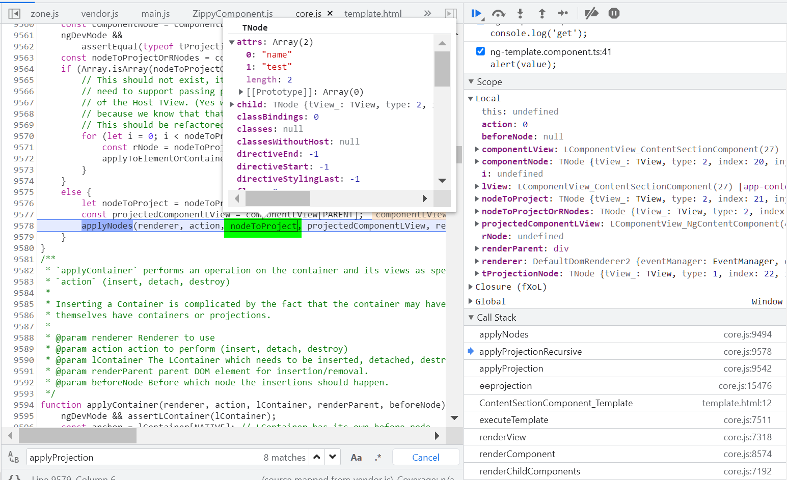 applyProjectionRecursive 函数里的 nodeToProject,就是需要被投影的 DOM 节点: