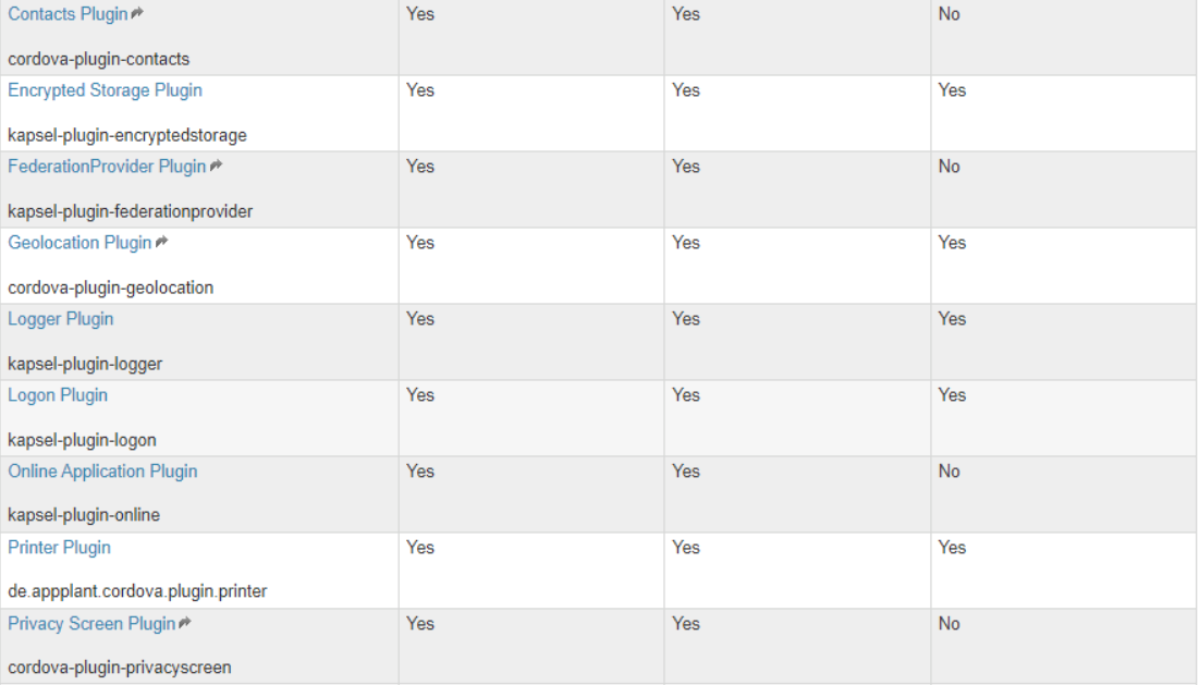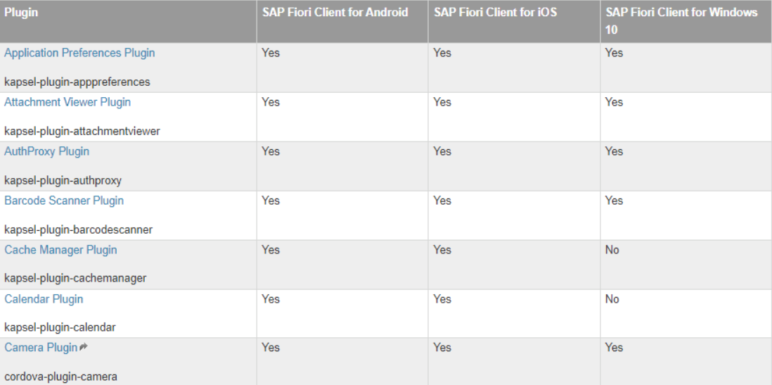 下表显示了 SAP Fiori Client 1.8(iOS、Android 和 Windows)中包含的插件。