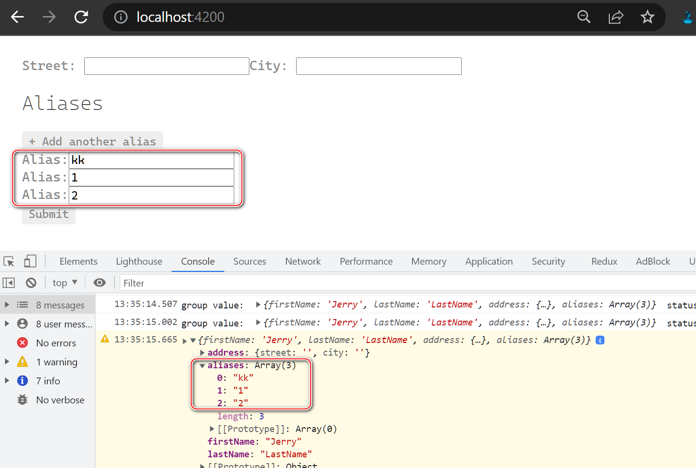 通过 formArrayName 和 formControlName 给这些匿名控件赋予了索引值,这样可以通过索引访问控件中的内容: