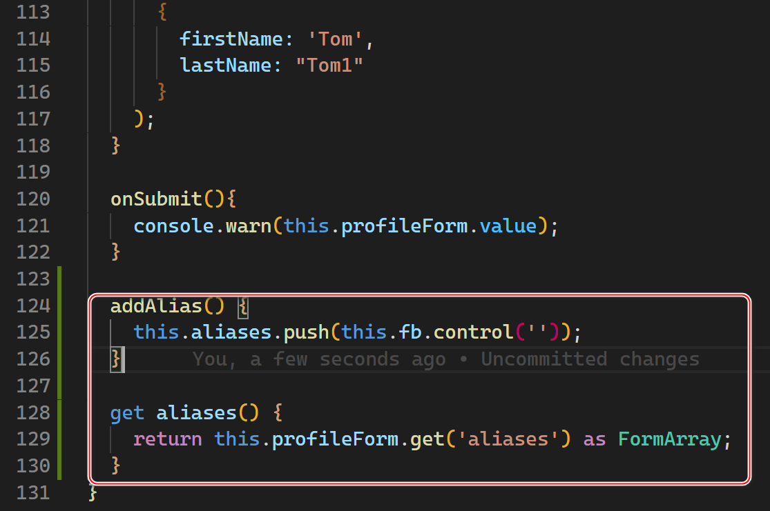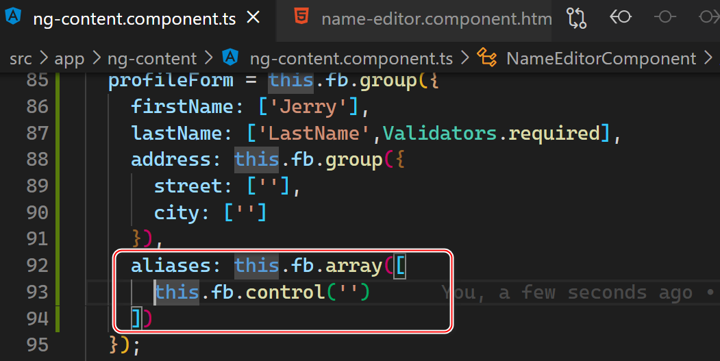 AbstractControl,所以你要为该方法提供一个显式的类型声明来访问 FormArray 特有的语法。