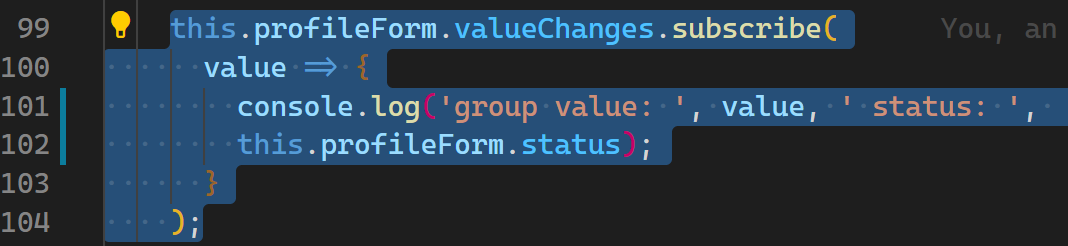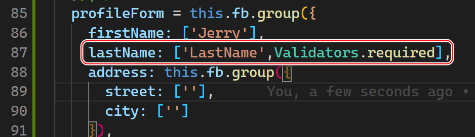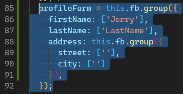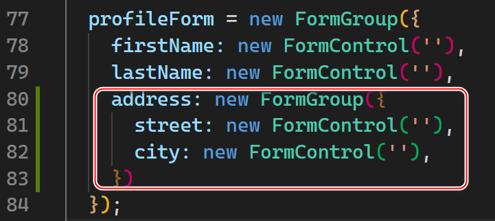我们可以在这个 FormGroup 构造函数的属性里,再增添一个类型为 FormGroup 的实例,形成嵌套的 form: