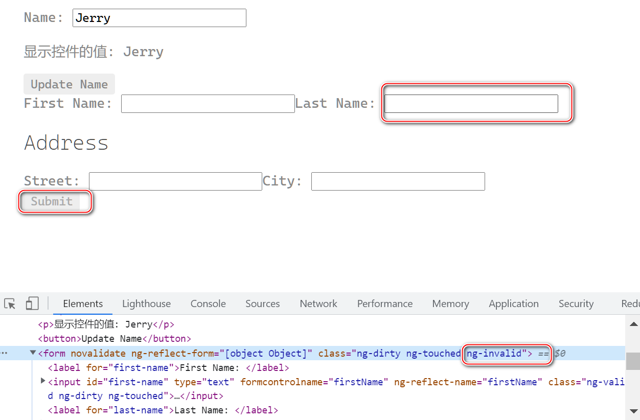 当 lastName 没有维护值时,整个 form 处于 ng-invalid 状态,submit 按钮无法点击。