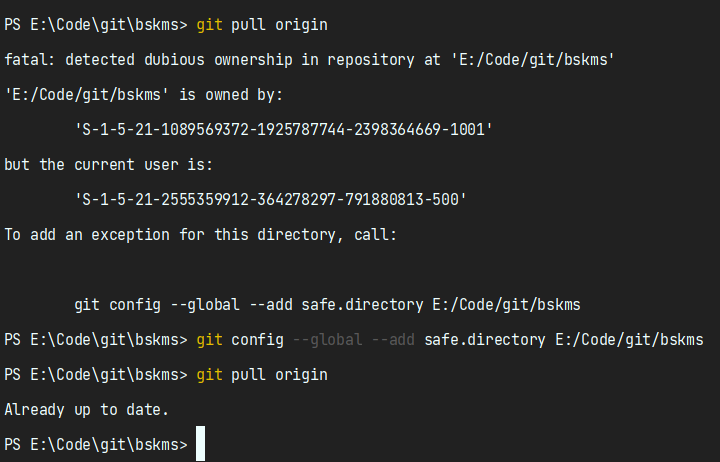 fatal: detected dubious ownership in repository at 'E:/Code/git/bskms'