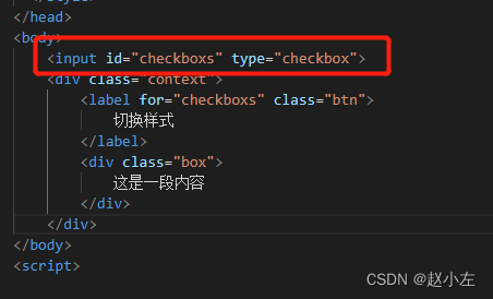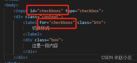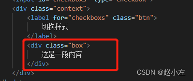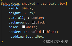 后面的 .context .box 不用多介绍了吧,大多数人看的懂,指的是,当你选中上面checkbox后,去修改 class 为context 下的 class名为 box的样式。