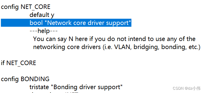 - menuconfig或者config后面空格隔开的大写字母表示的类似于 NETDEVICES 的就是这个配置项的配置项名字,这个字符串前面添加CONFIG_后就构成了.config中的配置项名字