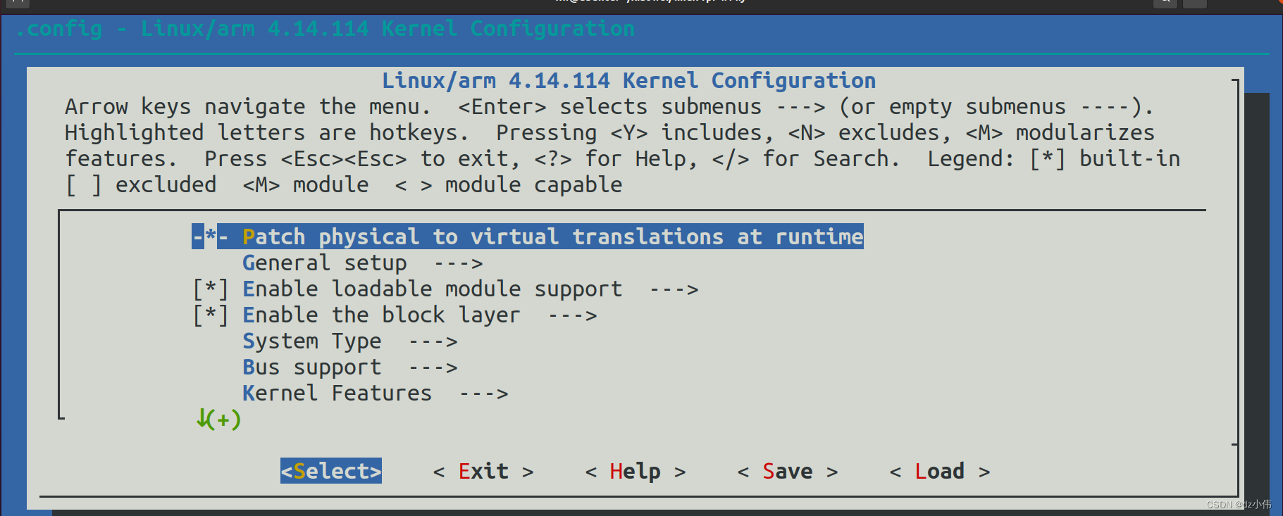 选择,退出,帮助 - 回车按键选择子菜单,选项后面有 --->的选项是有子菜单的,没有这个标识的没有子菜单