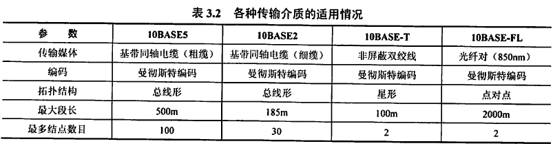 注意:10BASE-T非屏蔽双绞线以太网拓扑结构为星形网,星形网中心为集线器,但使用集线器的以太网在逻辑上仍然是一个总线形网,属于一个冲突域。上表的内容是常识,例如题目中出现10BASE5时,是不会显式地告诉你它的传输媒体、编码方式、拓扑结构等信息的。