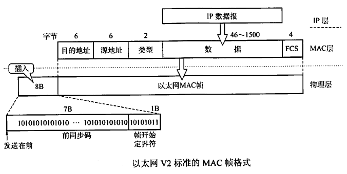 前导码:使接收端与发送端时钟同步。在帧前面插入的8字节可再分为两个字段: