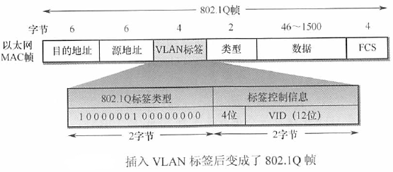 802.3ac标准定义了支持VLAN的以太网帧格式的扩展。它在以太网帧中插入一个4字节的标识符(插入在源地址字段和类型字段之间),称为VLAN标签,用来指明发送该帧的计算机属于哪个虚拟局域网。插入VLAN标签的帧称为802.1Q帧。由于VLAN帧的首部增加了4字节,因此以太网的最大帧长从原来的1518字节变为1522字节。