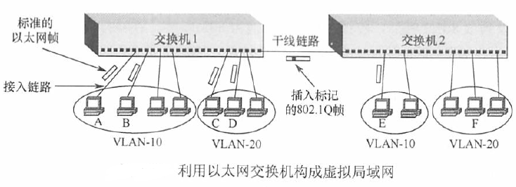 假定A向E发送帧,交换机1必须把帧转发到交换机2,但在转发前,要插入VLAN标签,否则交换机2不知道应把帧转发给哪个VLAN。因此在交换机端口之间的链路上传送的帧是802.1Q帧。交换机2在向E转发帧之前,要拿走已插入的VLAN标签,因此E收到的帧是A发送的标准以太网帧,而不是802.1Q帧。