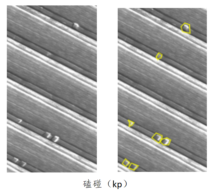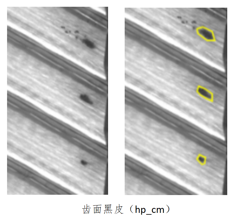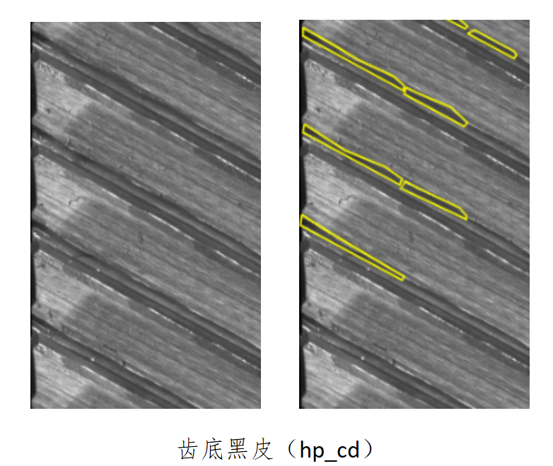 数据集中的图片均为真实缺陷齿轮的平面展开图,并由专业人员标注。样图中会明确标识影像中所包含的缺陷和识别线类型。