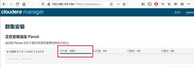 由于之前已经将parcel文件下载到master机器上,因此下载安装包的进度一开始就是百分之百,耐心等待后面的分配、解压、激活等步骤自动完成: