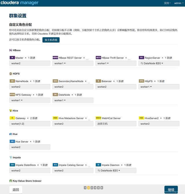 角色设置页面,将没有分配主机的服务分配到某一台机器上,我这里都选择了worker1: