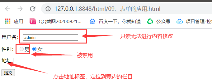 本部分学习表单的部分属性使用如只读(readonly)、disabled(禁用)以及使用label标签(增强鼠标可用性,点击对应label标签能够锁定对应标签)