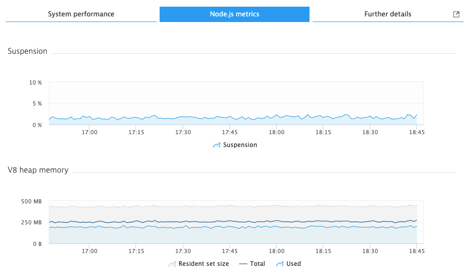 随后的页面将显示所选任何给定指标的平均利用率。 单击单个 pod 将进入其进程详细信息页面,其中可以查看有关 cpu/内存利用率和重新启动时间的信息。 对于 SSR,有关 CPU 的详细信息将在系统性能选项卡下,而有关 V8 内存使用的详细信息将在 Node.js 指标选项卡下。