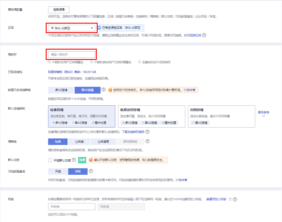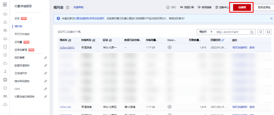 在此处点击创建桶,分别在区域华北-北京一,华北-北京四创建OBS桶。如下图所示。