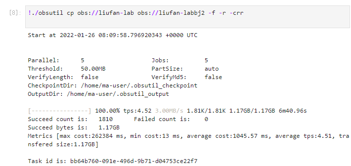 6.调用cp命令,指定采用跨区域复制模式将源桶对象复制到目标桶: