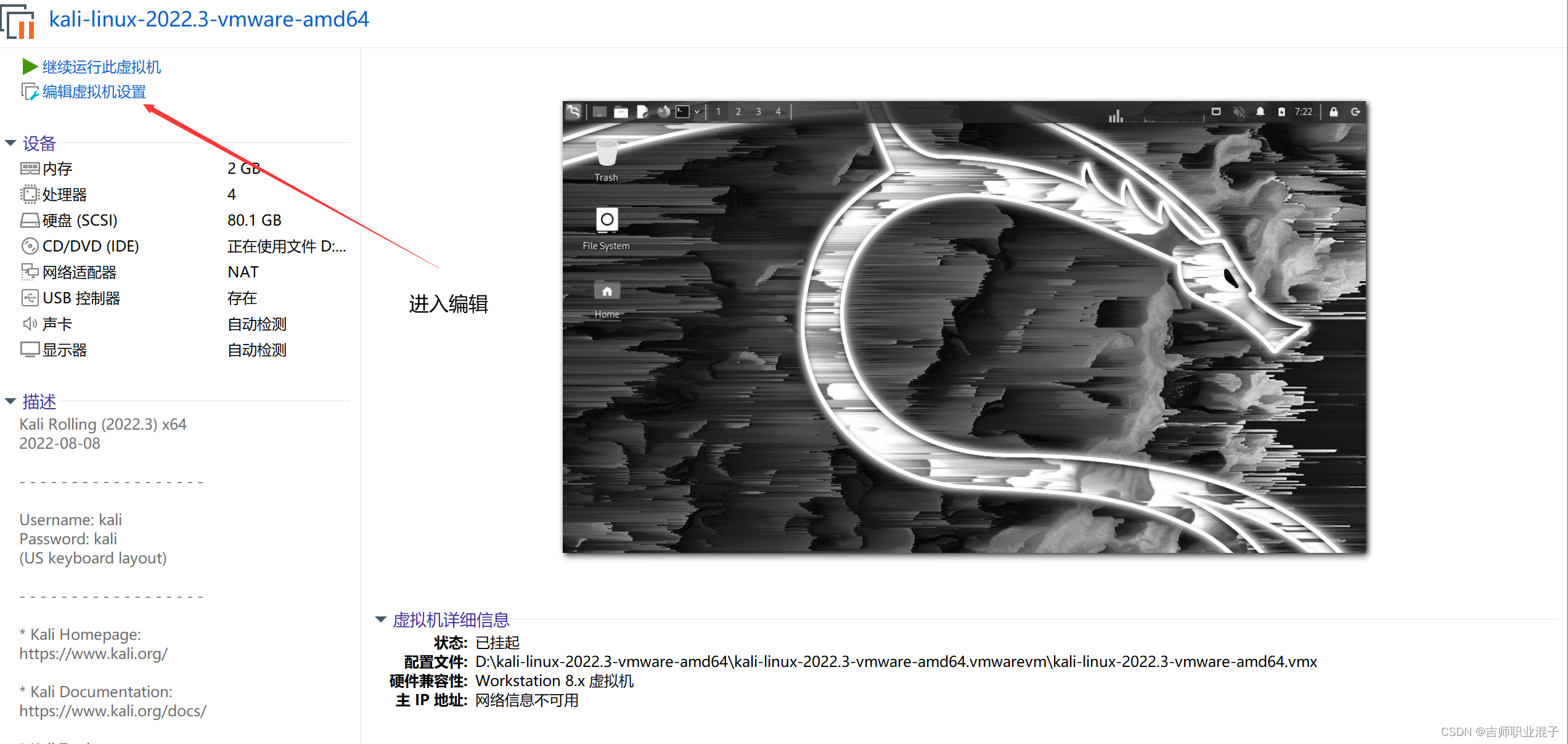 相信很多大佬都是在kali界面下载压缩包并直接启用的预设虚拟机,(如果下载镜像当我没说)