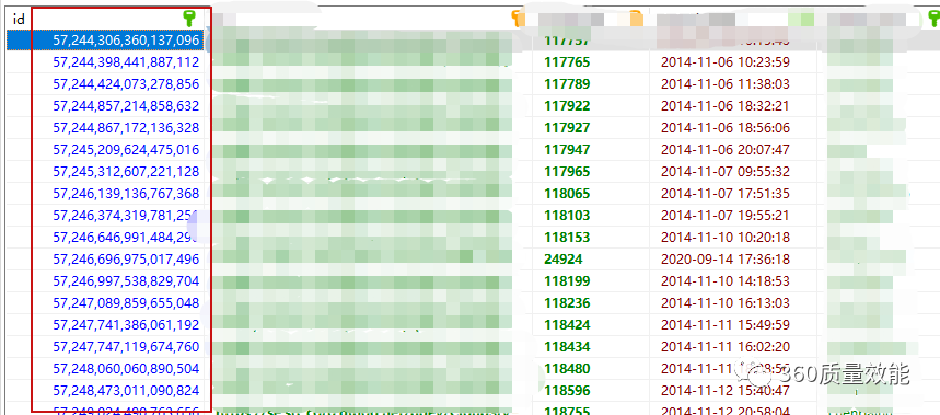 采用Snowflake算法后,数据id可以保持时间递增并且全局唯一。
