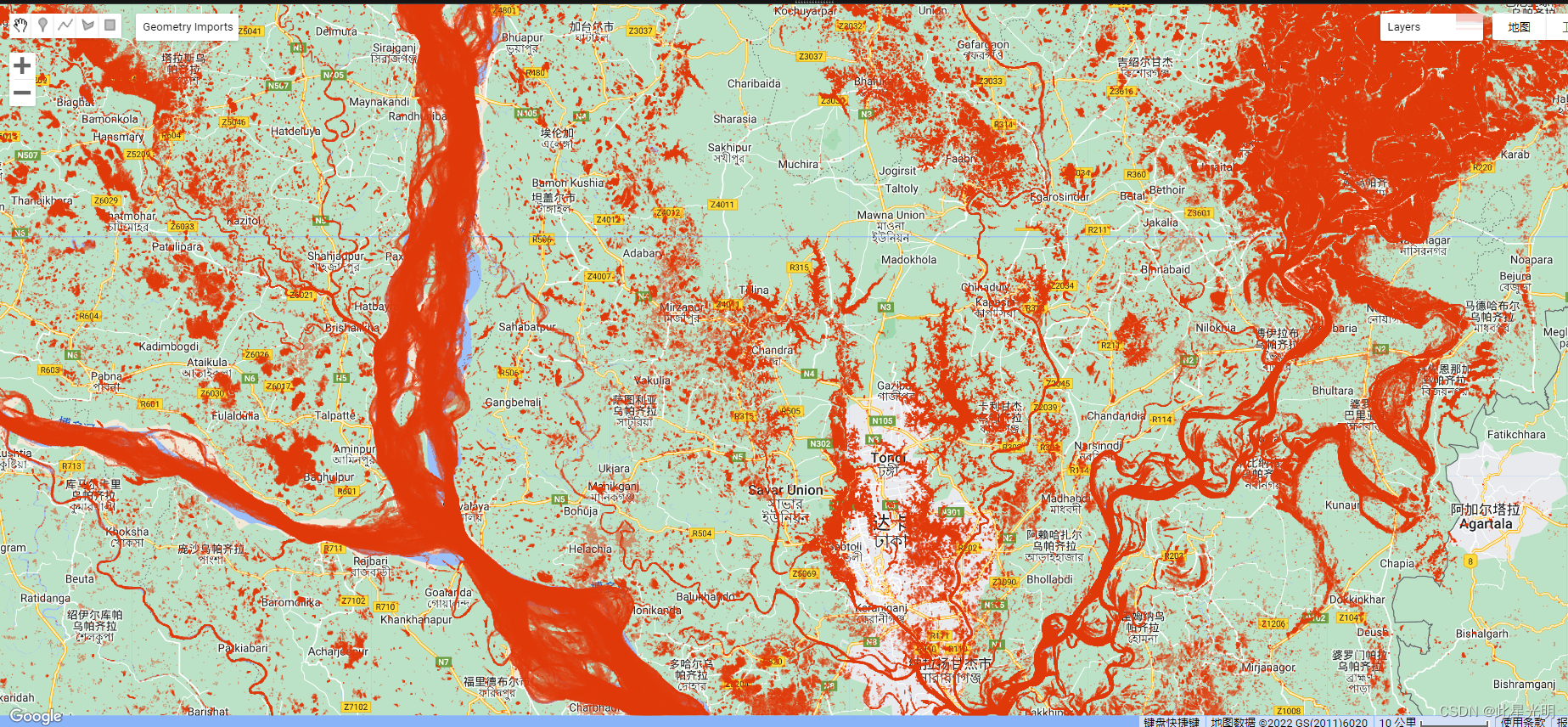下面的代码修改的,修改的主要目的就是为了让其没有共享的矢量文件不影响操作,我们这里利用在线的画图工具画一个几何,代替原有的孟加拉国矢量边界,用于提取具体的河流信息。