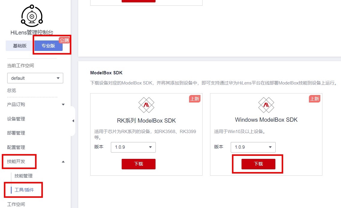 2) 在HiLens管理控制台专业版的技能开发-工具/插件板块下载Windows ModelBox SDK: