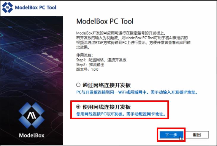 4) 在ModelBox PC Tool界面中选择“使用网线连接开发板”,点击“下一步”:
