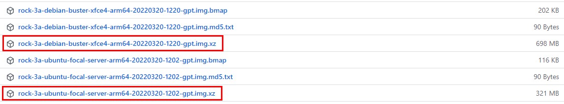 在github网站下载对应的镜像,镜像版本可以按需选择(本教程基于Ubuntu 20.04),下载的镜像需要是rock-3a开头并以gpt.img.xz结尾的文件。如果github下载较慢,也可以从这个OBS地址下载,目前我们建议下载0320版本,最新的版本在WIFI驱动上还有问题。