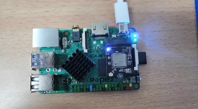 烧录完成之后拔出TF卡,接到板子上(芯片面朝向主板),然后接通电源,开发板正常启动会亮两个灯:绿灯常亮,蓝灯闪烁