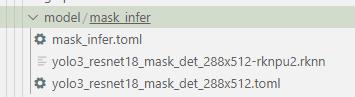 其中yolo3_resnet18_mask_det_288x512-rknpu2.rknn是转换好的rknn模型,mask_infer.toml是该模型的ModelBox功能单元配置文件,其内容如下: