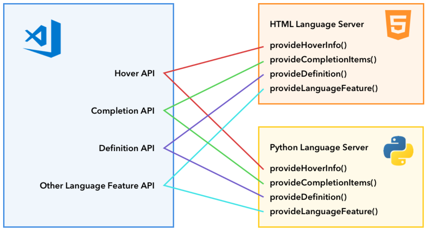 编程语言功能包括自动完成、错误检查和跳转到定义。这些特性通常由语言服务器(Language Server)提供,这是一个分析项目以提供动态特性的程序。一个例子就是VS Code中绑定的typescript-language-features扩展。原理如下图所示: