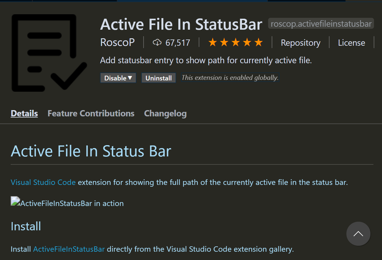 这个扩展可以在 Visual Studio Code 的状态栏上实时显示当前选中文件在文件系统中的绝对路径,如下图所示: