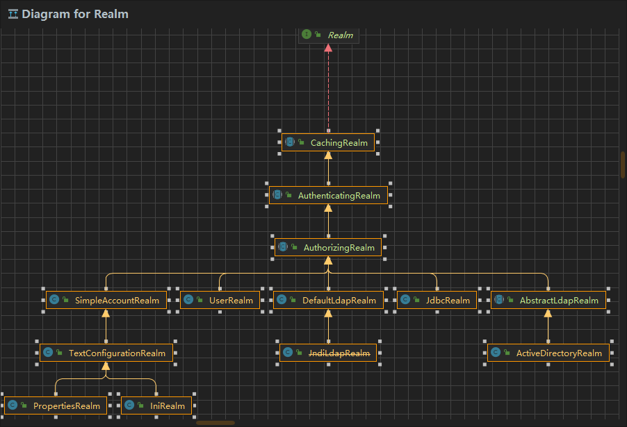 - 可以看到realm其实包含在SecurityManager中,其实realm的作用就是被SecurityManager调用,来作为Autherticator的一部分使用的.