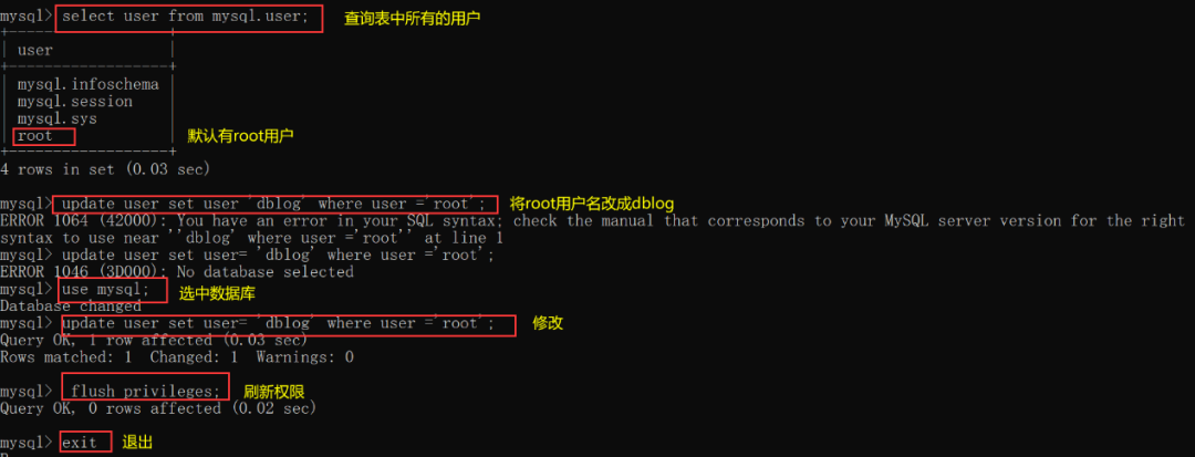 7.至此,mysql中,将root用户名修改成dblog就完成了。