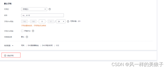 如果VPC内部需要多个子网,可单击“添加子网”进行添加,也可在VPC创建后根据需要进行添加。