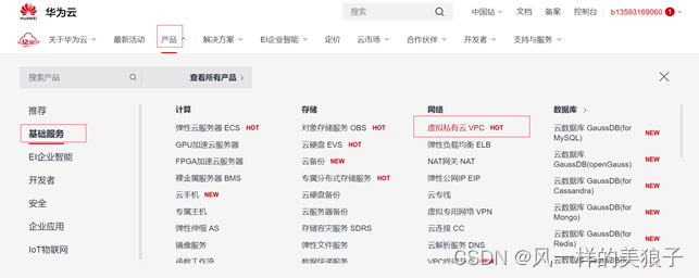 登录华为云平台,选择“产品”->“基础服务”->“虚拟私有云VPC”