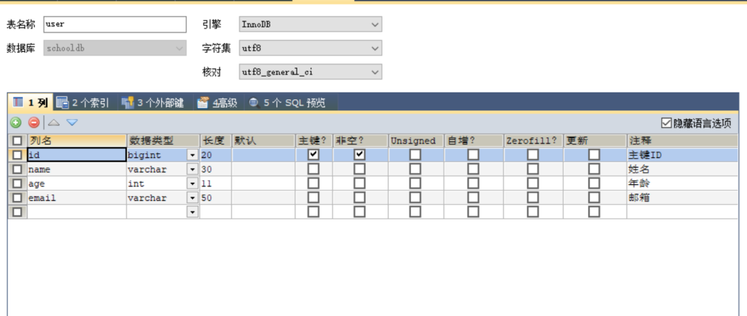 在mysql数据库中创建User表