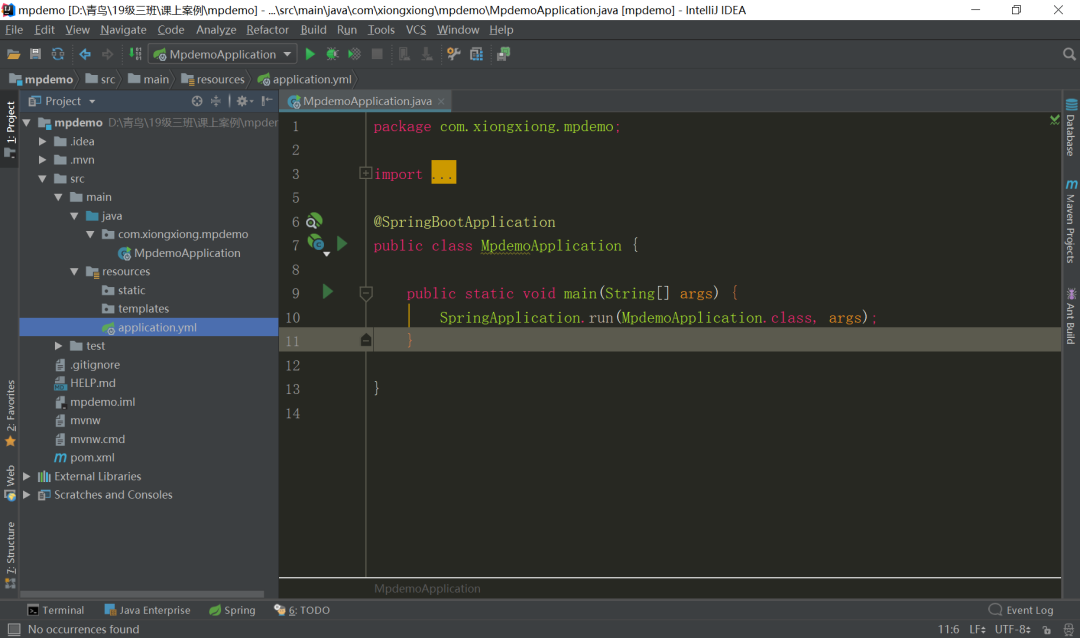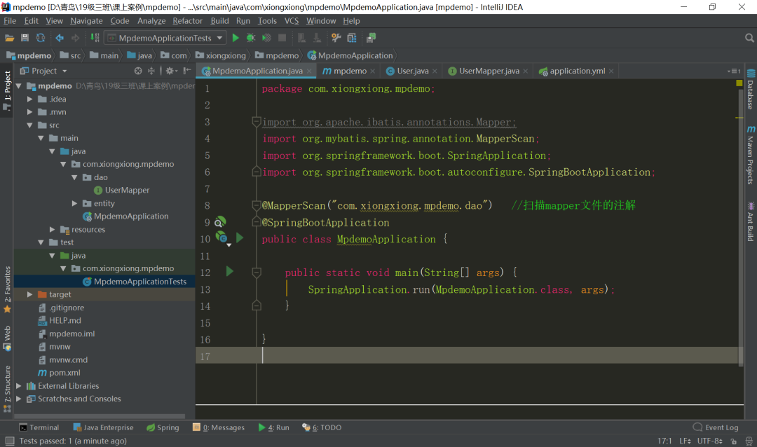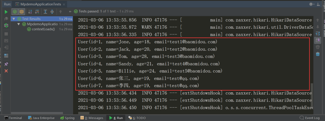 现在我们就可以去写个测试类进行测试了,我们就先来测试个查询全部数据功能。打开src/test/java/com.xiongxiong.mpdemo的MpdemoApplicationTests类,我们直接在contextLoads()方法中,写查询的代码: