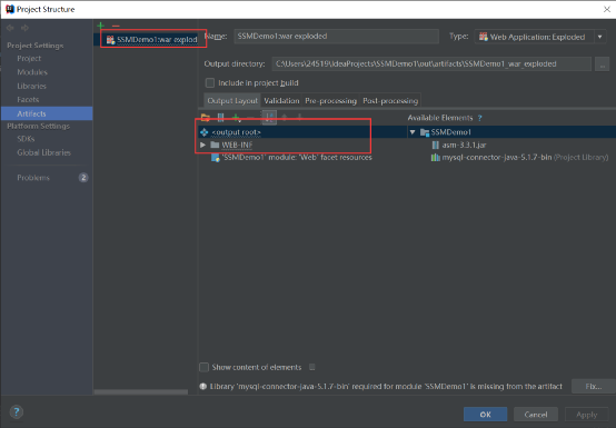 2.点击File–>Project Structure–>Artifacts,你会发现你项目上划了个波浪线。