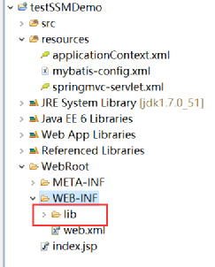 将SSM所需的jar包复制到项目的/WebRoot/WEB-INF/lib中,在这里我整理了下,大致需要34个jar文件,复制完之后,选中所有jar包,右击—Build Path–>Add to Build Path。