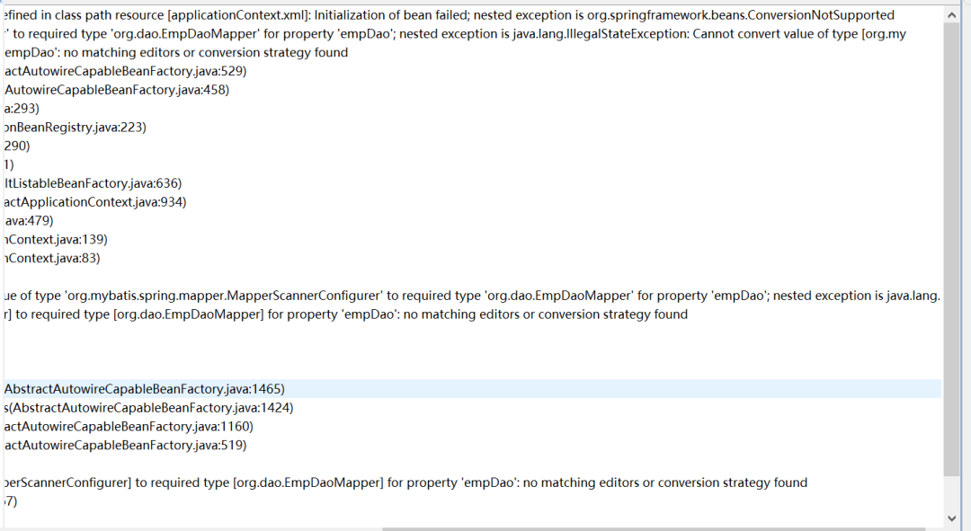org.springframework.beans.factory.BeanCreationException: Error creating bean with name 'empService' defined in class path resource [applicationContext.xml]: Initialization of bean failed; nested exception is org.springframework.beans.ConversionNotSupportedException: Failed to convert property value of type 'org.mybatis.spring.mapper.MapperScannerConfigurer' to required type 'org.dao.EmpDaoMapper' for property 'empDao'; nested exception is java.lang.IllegalStateException: Cannot convert value of type [org.mybatis.spring.mapper.MapperScannerConfigurer] to required type [org.dao.EmpDaoMapper] for property 'empDao': no matching editors or conversion strategy found