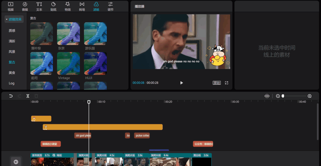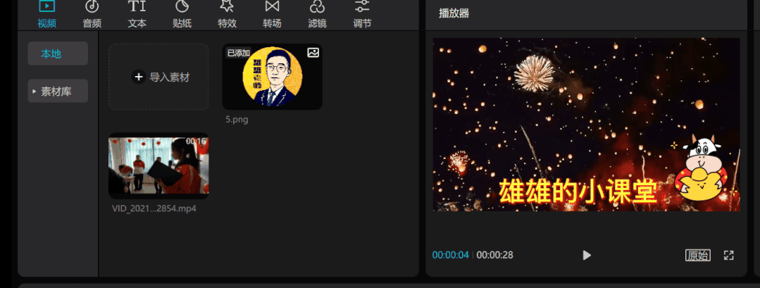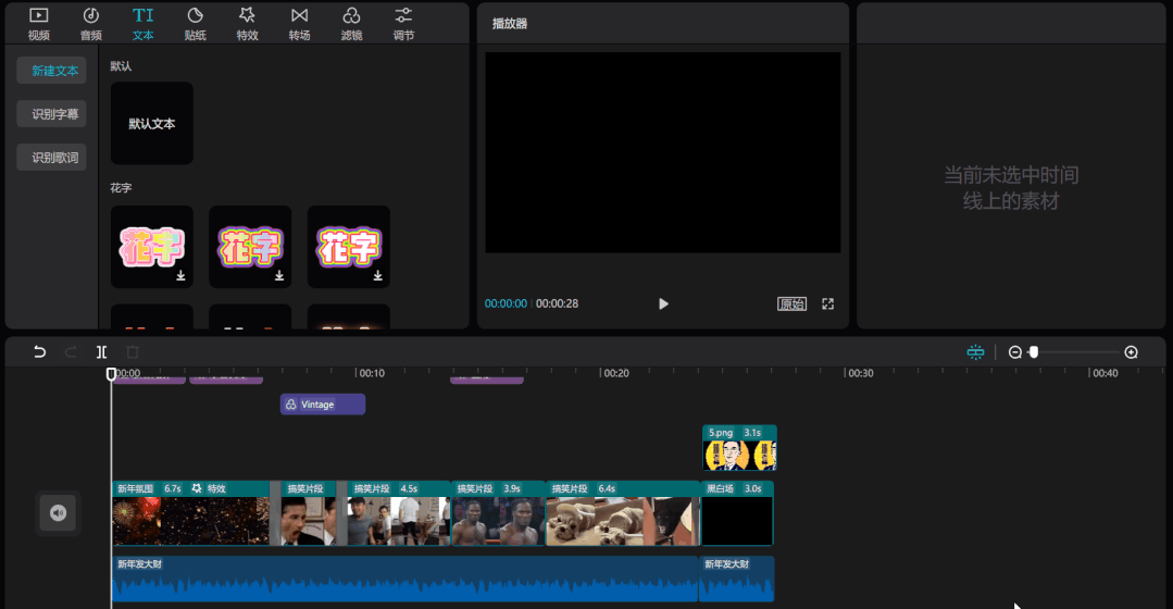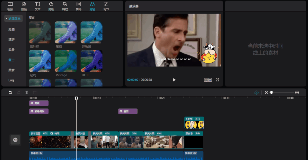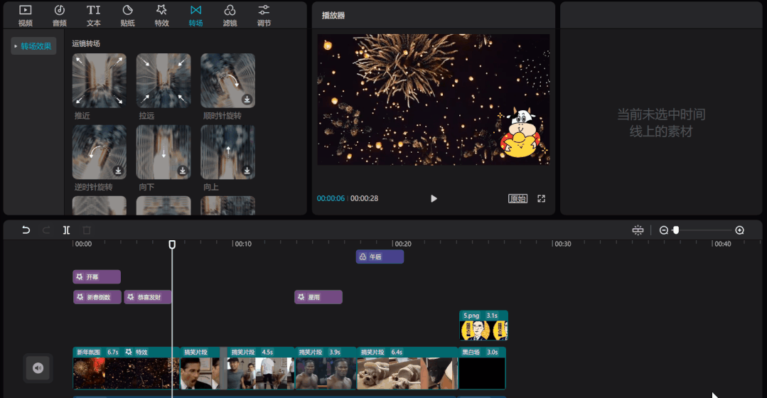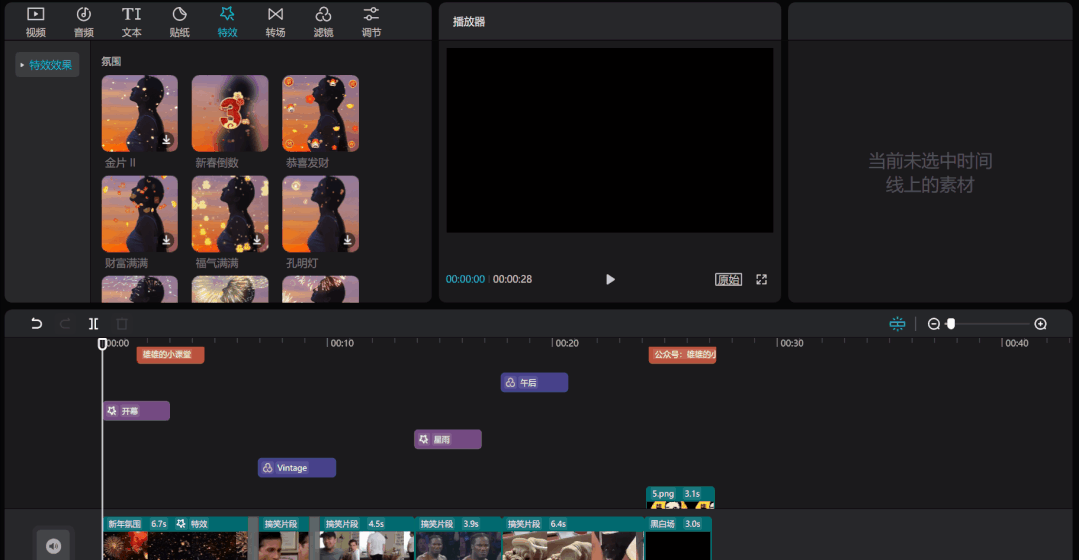 特效里面有好多效果:新春倒数、恭喜发财、烟花、孔明灯、生日快乐等等,使用方法也很简单,直接拉到轨道上即可。