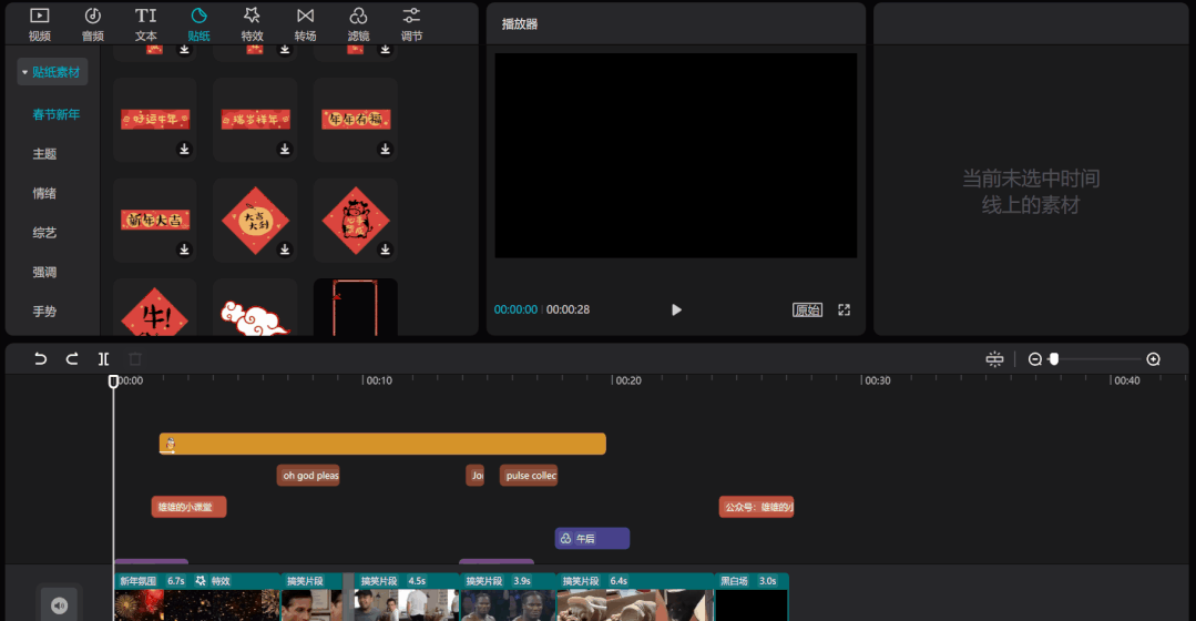 贴纸菜单中分为:春节新年(根据当前节日自动切换)、主题、情绪、综艺、强调、手势、动物头像等等……