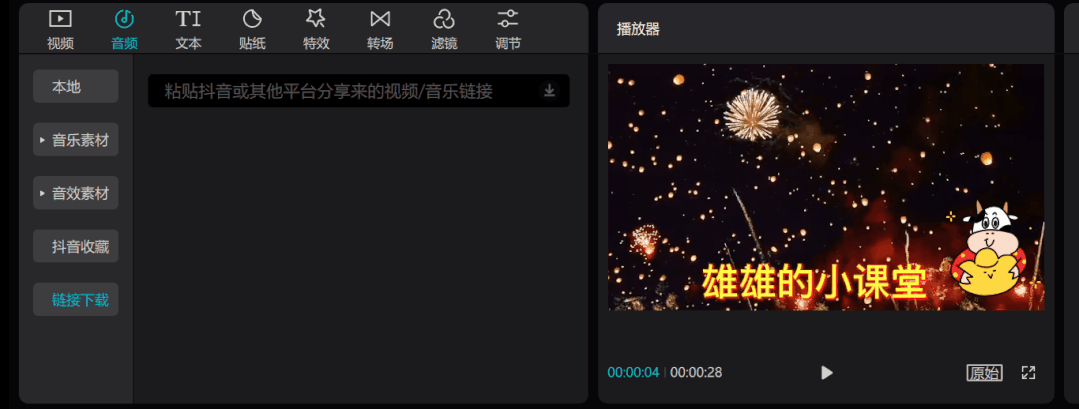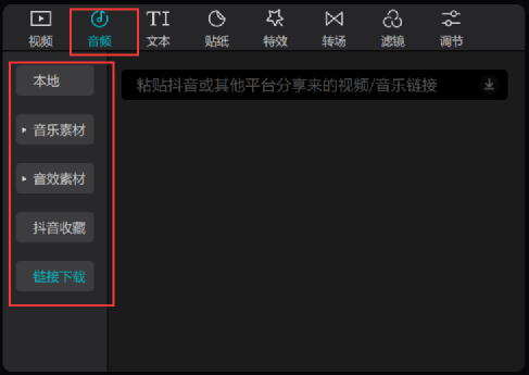 音频菜单中分为五个:本地、音乐素材、音效素材、抖音收藏和链接下载。